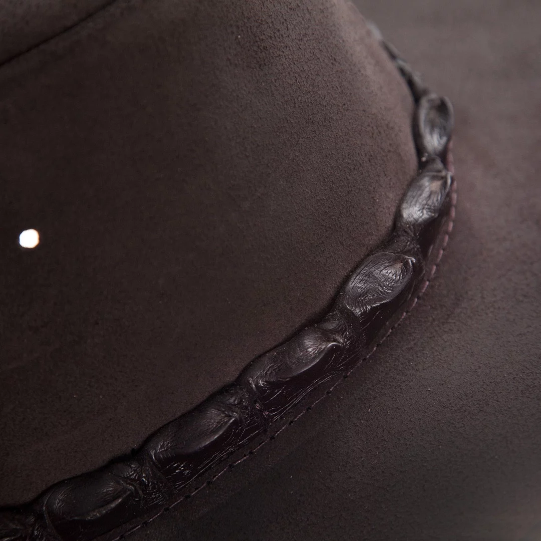 Elevate your style with the Dark Suede Hat with Genuine Crocodile Trim, a stunning combination of premium suede and authentic crocodile leather detailing. Designed for versatility and durability, this unisex hat is perfect for outdoor adventures, casual wear, or making a bold fashion statement. Crafted with meticulous attention to detail, it offers the ideal blend of rugged charm and luxurious sophistication.