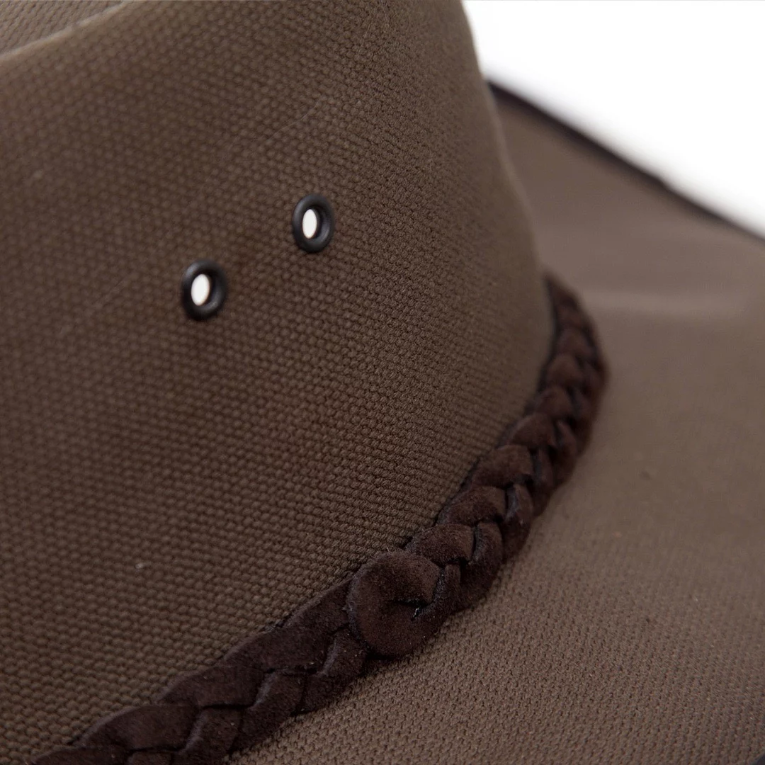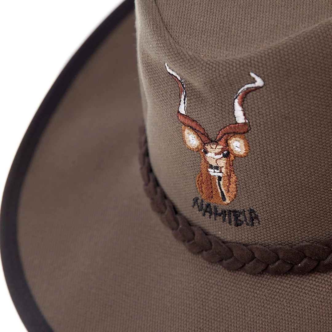 Celebrate the spirit of the outdoors with the Full Canvas Hat with Braid and Kudu – South Africa or Namibia Edition. Made from durable 510g Endurer cotton canvas in a versatile sand/olive color combination, this unisex hat is designed for adventure. Accented with a full-grain kudu leather trim and classic braid, it’s the perfect blend of heritage, functionality, and style—ideal for safari, travel, and everyday wear.